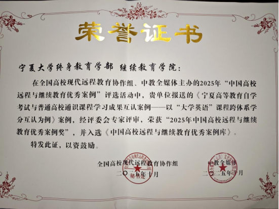 2025年10月29—30日,2025(第十一届)中国远程与继续教育大会在北京举行。由终身教育学部李晓红、姜玉梅共同撰写的《宁夏高等教育自学考试与普通高校通识课程学习成果互认案例——以“大学英语”课程跨体系学分互认为例》案例荣获“2025年中国高校远程与继续教育优秀案例奖”,并入选《中国高校远程与继续教育优秀案例库》。